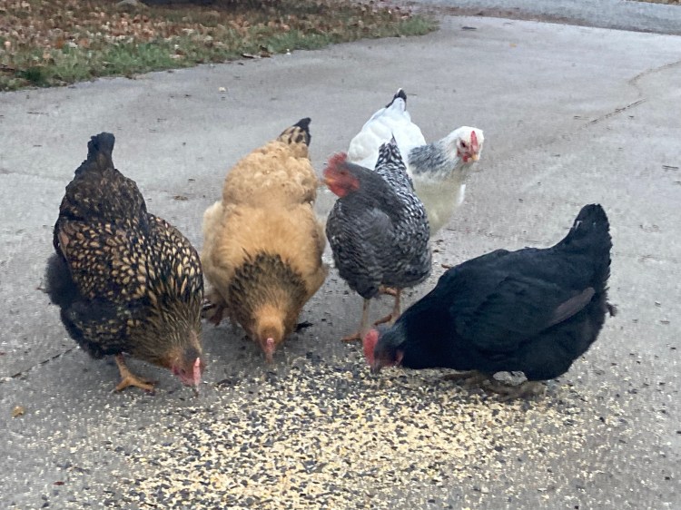 We currently have 7 hens, a mix of heritage breeds. They’re Dorothy, Stan, Sophia, Graham Cracker, Snowflake, Fast Car, Curious George, and Dynamite. (Stan and Curious George are hens; we have no roosters.) They roam around the property all day long but won’t bother you. They mostly bother my carefully planted flowers.