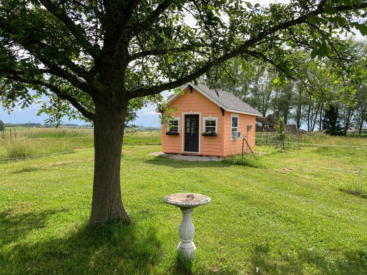 I (Jenna) created this to be a writer’s cabin—a quiet place to be with your thoughts, your books, your writing, and a few llamas and sheep. The cabin is on the western side of our blueberry farm, within sight of the barn and blueberry field. Readers, writers, scholars, contemplatives, parents who need a break….anyone in need of nature and a little quiet time should enjoy this beautiful, cozy spot.